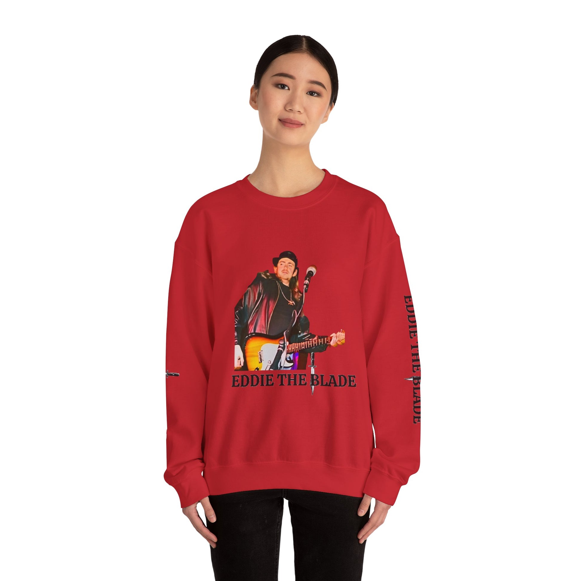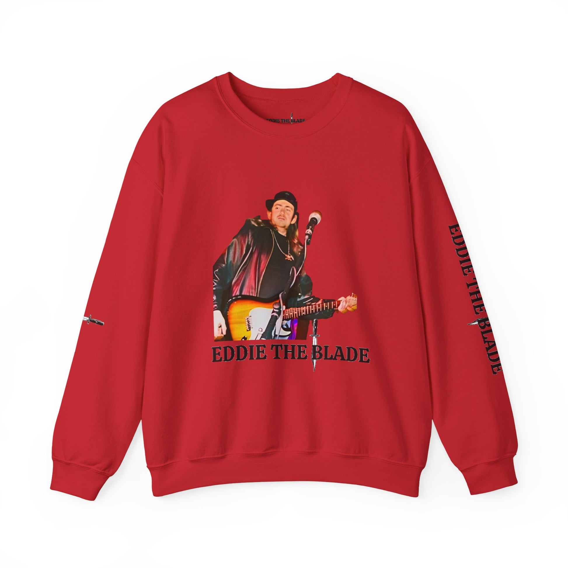 This EDDIE the blade red sweatshirt is expertly crafted for durability and comfort. Made with high-quality materials, it offers an exceptional fit and feel. The red color adds a stylish touch, making it the perfect addition to any wardrobe. Stay sharp and warm with EDDIE.Ideal for any situation, a unisex heavy blend crewneck sweatshirt is pure comfort. These garments are made from polyester and cotton. This combination helps designs come out looking fresh and beautiful. The collar is ribbed knit, so it retains its shape even after washing. There are no itchy side seams on these sweaters.