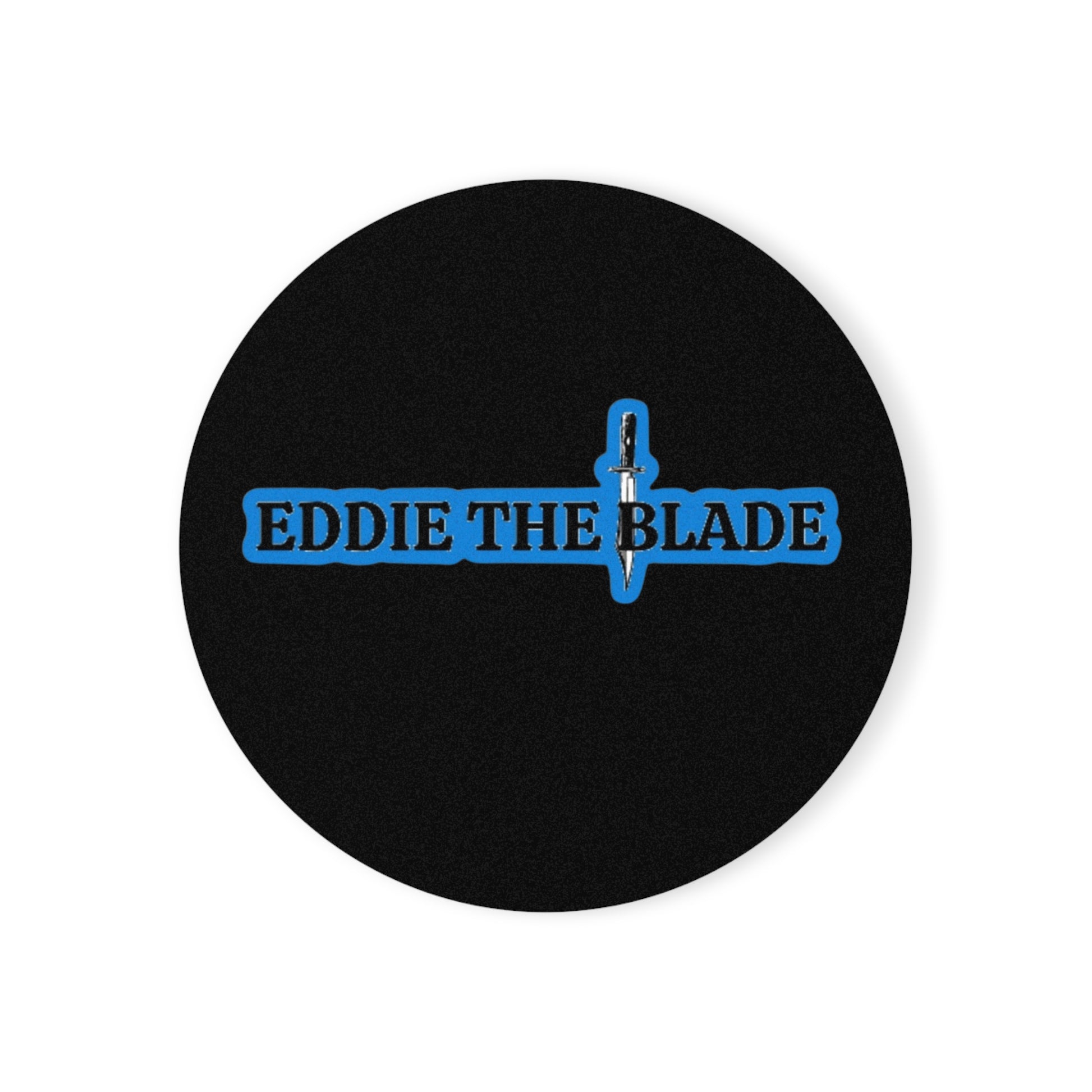 Expertly crafted from durable materials, Eddie the blade round coasters in sleek black with a bold blue logo add a touch of style to any surface. Protect your furniture while showcasing your love for Eddie the blade.This personalized photo coaster helps you market yourself the right way or uplift any table with a custom touch. Each round and square coaster is made with a high-gloss, polyester-coated hardboard top, and features a genuine cork bottom to prevent sliding.